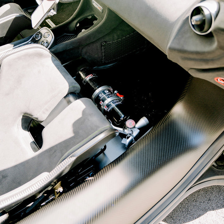 RSpro's Fire Extinguisher Mount - the perfect solution to ensure your safety in emergency situations. This innovative mount securely installs under your seat, providing immediate access to a fire extinguisher when needed. Whether you're racing on a track or simply driving on the road, having a fire extinguisher is essential. Designed to perfectly fit McLaren seat styles, our mount offers an OEM look and finish. Plus, we've integrated Rennline's Quick Disconnect mounting system, allowing for easy removal of the fire extinguisher when not in use. Stay prepared and protected with the RSpro Fire Extinguisher Mount.